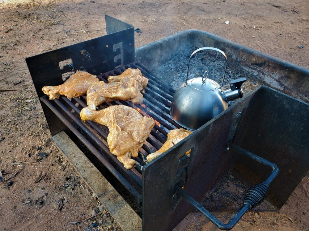 ভেবেছিলাম আগুন ধরানো খুবই সহজ। কিন্তু পনেরো মিনিট যায়, আধা ঘণ্টা যায়, গর্তে ধোঁয়া ছাড়া কিছু তৈরি হয় না। প্রিন্সের মেজাজ ধীরে ধীরে খারাপ হচ্ছে। আমি কীভাবে সাহায্য করব, বুঝতে পারছি না। মনে হচ্ছে উড চিপস বা কাঠের ছোট টুকরো না এনে ভুল করেছি। আমাদের ধারণা ছিল ফায়ার স্টার্টা‌র আর দাহ্য তরল দিয়েই আগুন ধরানো যাবে। কিন্তু কাজ হচ্ছে না। দাহ্য তরলটুকু জ্বলে শেষ হয়ে যায়, মূল লাকড়িতে আগুন ধরে না। কোথাও নিশ্চয় ভুল করছি। অবশেষে অনেক চেষ্টার পর অগ্নি মহাশয়া রাজি হলেন মুখ দেখাতে। মিনিট বিশেক পর যখন শিকগুলো গরম হল, মেরিনেড করা মুরগী চড়িয়ে দিলাম। শিকের গরম আর আগুনের তাপে মুরগী কাবাব হবে। একপাশে চায়ের কেতলিও বসিয়ে দিলাম। পানি গরম হোক। ফ্লাস্কে ভরে রেখে দিলে আট ঘণ্টার মত গরম থাকবে। ঘণ্টায় ঘণ্টায় চা খেতে ইচ্ছে হলে খাওয়া যাবে। এইবেলা বলে রাখি, বাংলাদেশে লম্বা শিকের মধ্যে আস্ত মুরগী ঢুকিয়ে আমরা ‘গ্রিল’ বলে যেটা চালাই, সেটা গ্রিল নয়। সেটা হল রোটিসেরি (rotisserie)। গ্রিলিং বলতে পাশের ছবির মত গ্রিল বা লোহার শিকের উপর মাছ, মাংস, সবজি চড়িয়ে সরাসরি আগুনের তাপে রান্না করাকে বুঝায়। আবার যদি কয়লার উত্তাপে আর ধোঁয়ার স্পর্শে খাবার পাকানো হয়, সেটা হবে বারবিকিউ। আমরা গ্রিল আর বারবিকিউ, দুই ধরনের পদ্ধতিতেই রান্না করেছি। প্রথমে ছিল গ্রিলিং, পরে আগুন নিভে যাওয়ায় কয়লার তাপে হয়েছে বারবিকিউ।