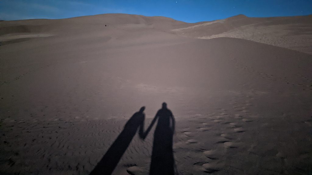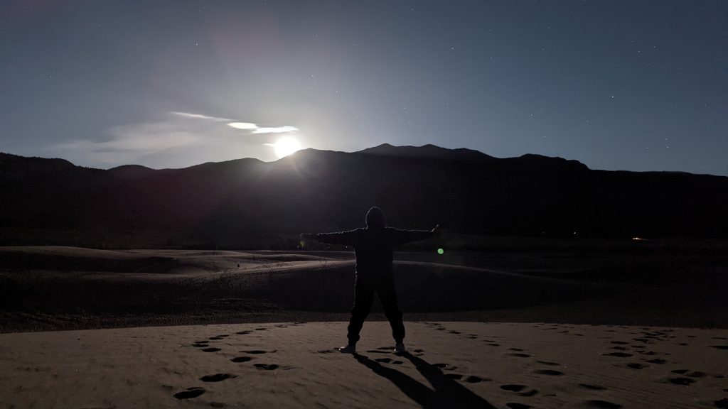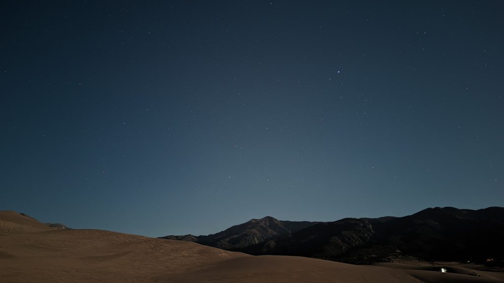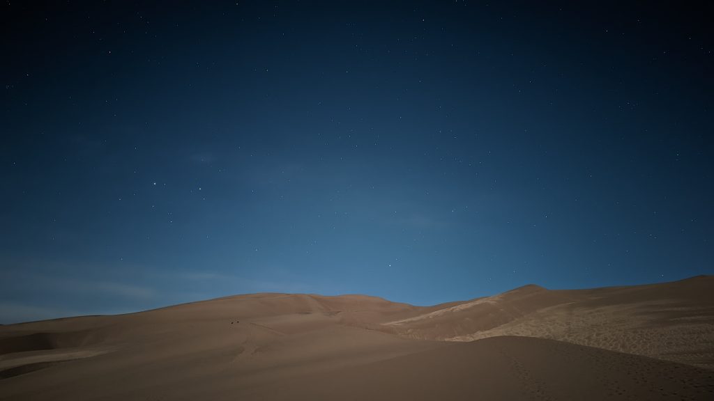 এই মুহূর্তে ঘড়িতে বাজে রাত দশটা। দূরে রকি পর্বতের কালো সারির পেছন থেকে ঘোলাটে আলোর আভাস পাচ্ছি। শুরু হয়েছে চাঁদ উঠা। গতকাল পূর্ণিমা গিয়েছে। আজকেও চাঁদ তাই ঝলমলে আলো নিয়ে উঠবে। চাঁদ উঠলে সেটার আলোয় আকাশে ফুটে থাকা তারামণ্ডলী ঢাকা পড়ে যাবে, আর আমাদের রাতের আকাশ দেখার বারোটা বাজবে। রাতের আকাশ দেখতে চাইলে সবচেয়ে ভালো সময় হলো অমাবশ্যা। কিন্তু পূর্ণিমার আলোয় গ্রেট স্যান্ড ডিউন্স দেখাও নাকি লাইফটাইম অভিজ্ঞতা। আমাদের তাই আফসোসের কিছু নেই। প্রিন্স চাইছে চাঁদের আলোয় দিগ্বিদিক ভেসে যাওয়ার আগে অনন্ত নক্ষত্রবীথিকে ক্যামেরায় বন্দী করতে। তাই অনবরত ছবি তুলে চলেছে (ছবি ১)। আর আমার করছে প্রচণ্ড পা ব্যথা। যতোটা না পরিশ্রমে, তারচেয়ে বেশি ঠাণ্ডায়। মরুভূমিতে যে রাতের বেলা এতো ঠাণ্ডা পড়ে, ধারণাই ছিল না। থাকলে শুধু ফ্লিস কাপড়ে বানানো সোয়েট শার্ট না, শেরপাটাই পরে আসতুম। এখন ঠাণ্ডায় কাঁপতে কাঁপতে বোঝো ঠ্যালা!