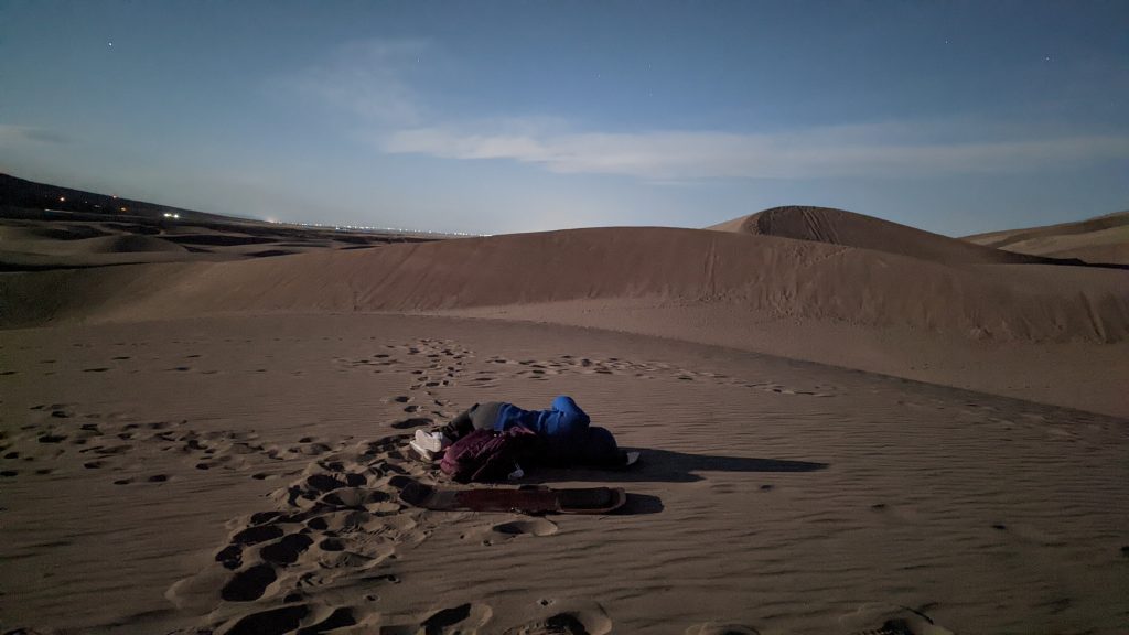 বলে রাখা ভালো, গ্রেট স্যান্ড ডিউন্স জাতীয় উদ্যানটা অনেকগুলো স্যান্ড ডিউন বা বালির ঢিবি (বা স্তূপ) নিয়ে গঠিত। আমরা যে ঢিবিতে খুঁটি গেড়েছি, তার আশেপাশে কেউ নেই। অনেক দূরের এক ঢিবিতে দুজন মানুষকে দেখা যাচ্ছে (ছবি ২)। ওখান থেকে হয়তো ঢিবির বিশালত্ব বুঝতে পারবেন। প্রিন্সকে নির্বিঘ্নে ছবি তুলতে দিয়ে আমি স্যান্ড বোর্ডকে বিছানা বানিয়ে শুয়ে পড়লাম (ছবি ৩)। এভাবে যদি ক্লান্তি কমে! কিন্তু শোয়ার পর আরও বেশি ঠাণ্ডা অনুভব করতে লাগলাম। টিপ নাম্বার দুই, যদি রাতের বেলা ঢিবিতে উঠতে চান, মোটা মোটা গরম কাপড় নিয়ে যান। হঠাৎ আমাদের খুব কাছে কে যেন খিলখিল করে হেসে উঠলো। সেই সাথে একটা ছেলে কণ্ঠ কিছু বলল। তারমানে আমরা একা নই। আশেপাশে আরেক জোড়া এসে ঘাঁটি গেড়েছে। একটু পর শুনি ছেলেমেয়ে দুটো ইংরেজি গান চালিয়ে দিলো। এই নীরব নিস্তব্ধ বালুচরে যান্ত্রিক সংগীত কেমন যেন বেসুরো লাগলো। নিজেরা গাইলেও হতো! কিন্তু কী আর করা? স্বাধীনতা বলে একটা বিমূর্ত ধারণা আছে। মানুষের স্বাধীনতায় আমি হস্তক্ষেপ করতে পারি না।